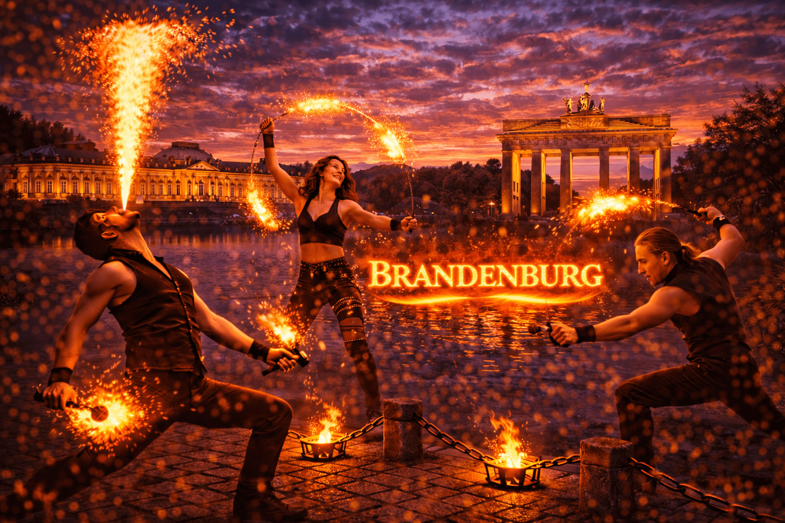 Wenn Sie in Brandenburg einen Feuerkünstler buchen, eine Feuerkünstlerin buchen oder ein außergewöhnliches Showprogramm planen, sind Sie bei uns genau richtig. Als erfahrene Feuershow Agentur, Feuerkünstler Agentur und Feuerspucker Agentur vermitteln wir professionelle Künstler für kleine Feiern ebenso wie für große Veranstaltungen.