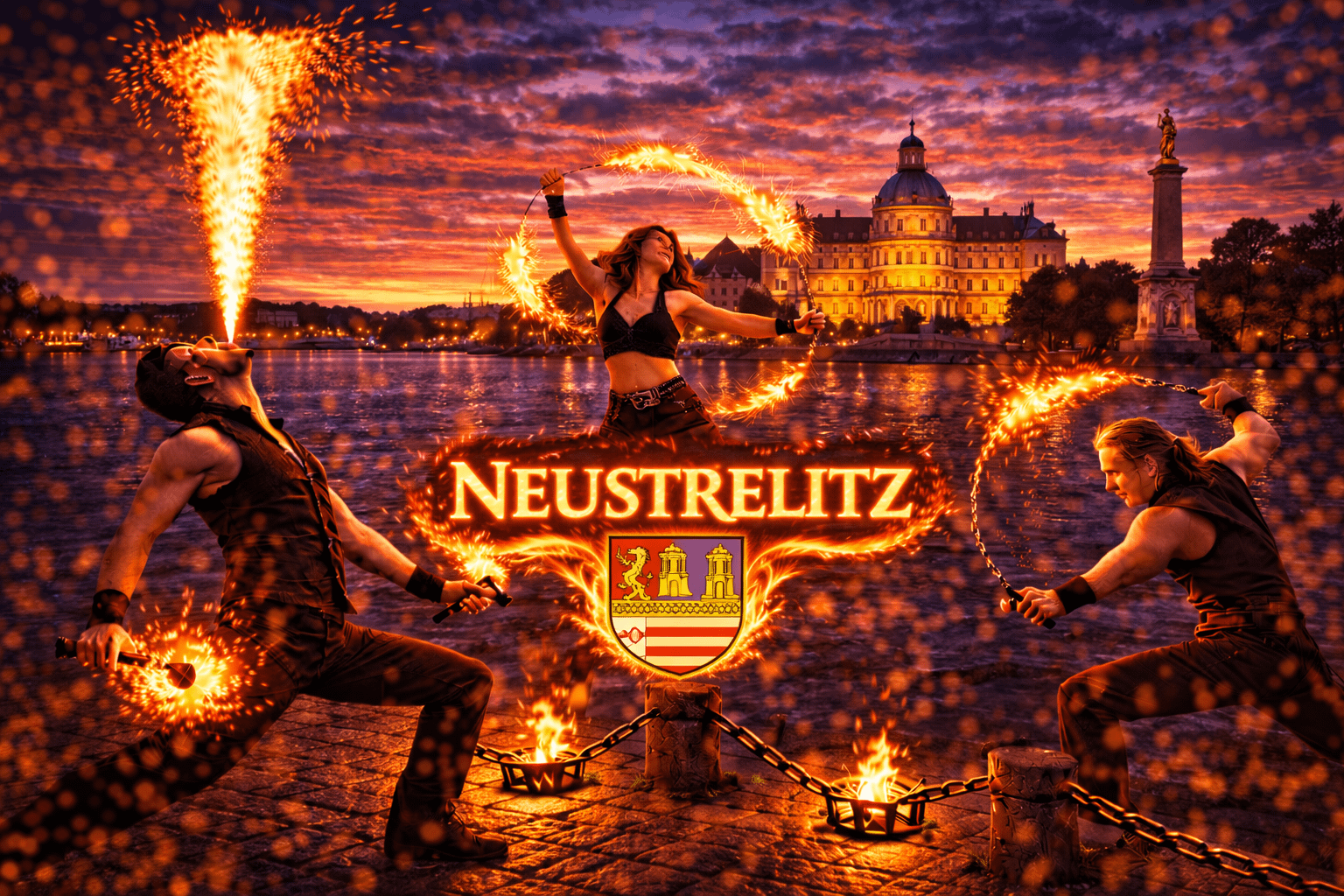 Neustrelitz gehört zu den schönsten Residenzstädten Mecklenburg-Vorpommerns und beeindruckt mit seiner historischen Stadtstruktur, dem Schlossgarten und der Nähe zur Mecklenburgischen Seenplatte. Die Stadt bietet mit ihren großzügigen Plätzen, Parkanlagen und Veranstaltungsorten eine außergewöhnliche Kulisse für Events aller Art. Zwischen Marktplatz, Schlosspark und verschiedenen Eventlocations finden jedes Jahr Hochzeiten, Firmenfeiern, Stadtfeste und private Veranstaltungen statt. Wenn Sie eine Feuershow in Neustrelitz buchen oder professionelle Feuerkünstler buchen in Neustrelitz möchten, sind Sie bei uns genau richtig.