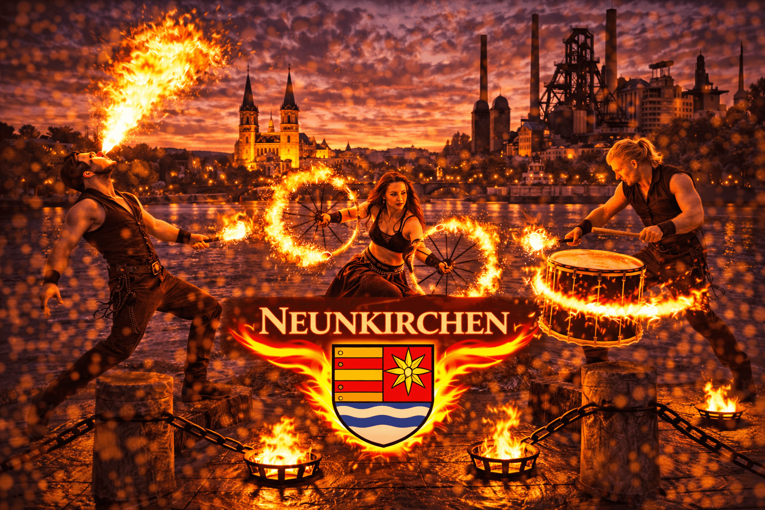 Neunkirchen im Saarland gehört zu den bedeutenden Städten der Region und blickt auf eine lange industrielle Geschichte zurück. Heute verbindet die Stadt moderne Veranstaltungsorte mit historischen Industrieanlagen und grünen Parkanlagen. Zwischen Innenstadt, Hüttenpark und zahlreichen Eventlocations finden regelmäßig Hochzeiten, Firmenveranstaltungen, Stadtfeste und private Events statt. Wenn Sie eine Feuershow in Neunkirchen buchen oder professionelle Feuerkünstler buchen in Neunkirchen möchten, sind Sie bei uns genau richtig.