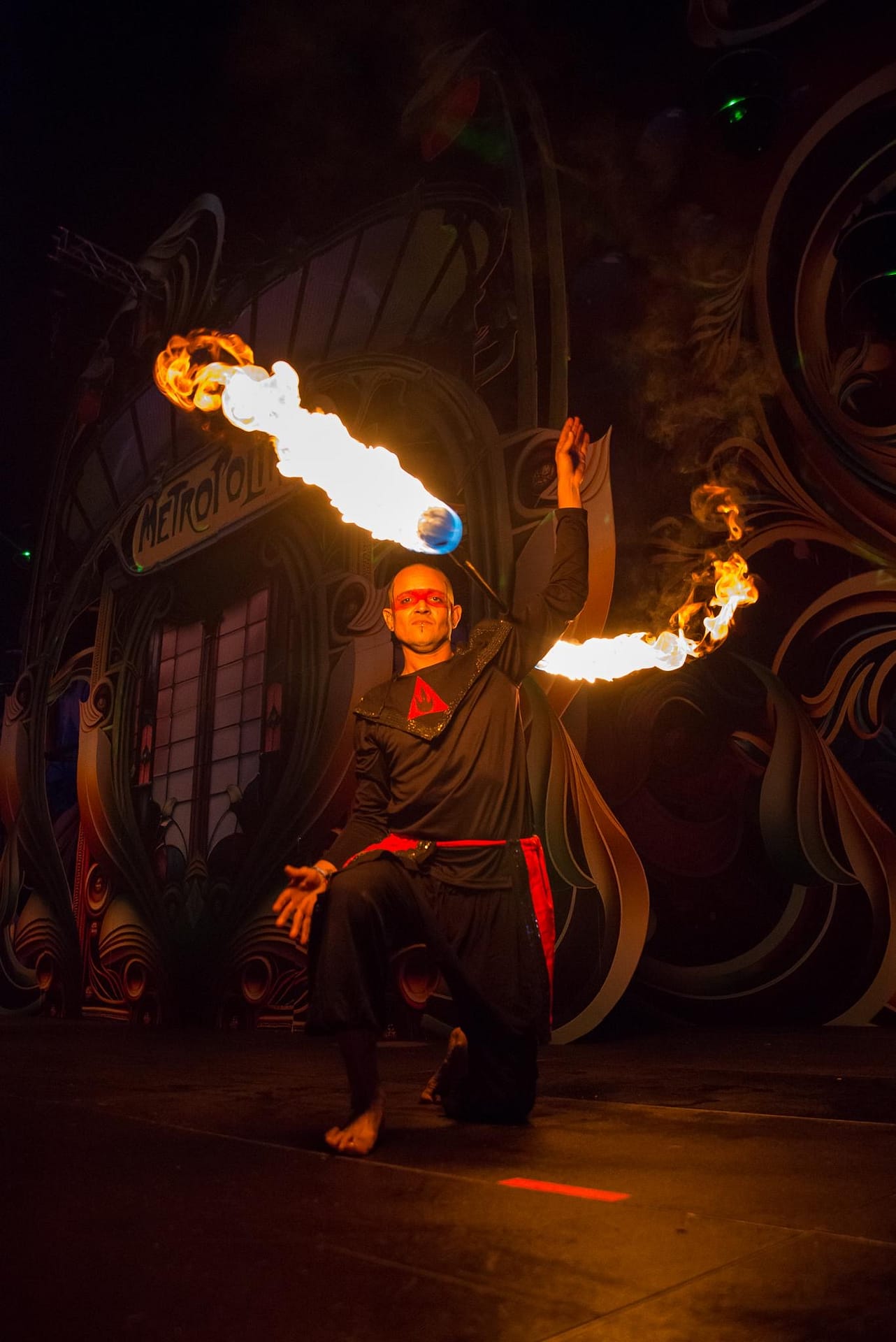 Bühnen auftritt. Mit seinem Hintergrund in moderner Feuerkunst, Flow Arts und akrobatischen Performanceformen steht er für dynamische, visuell starke Shows mit hoher technischer Präzision.